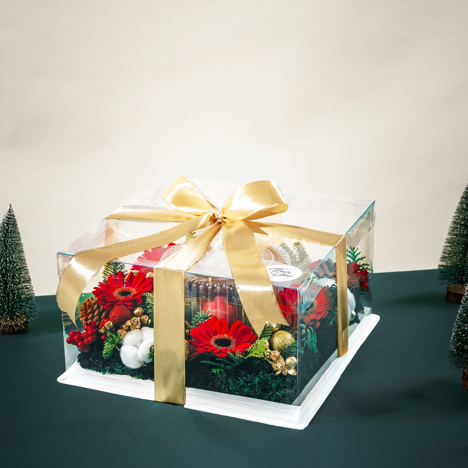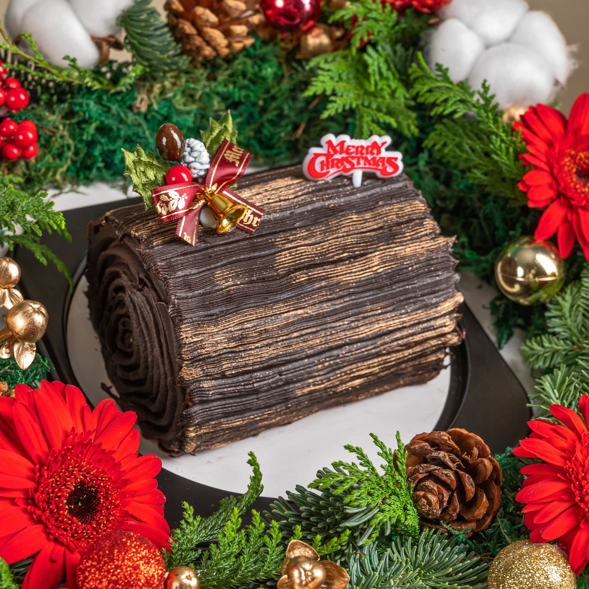 Who says you have to choose between cake and flowers this Christmas? Our festive Cake Garden brings both together in one show-stopping celebration! A delicious Yule Log takes center stage, surrounded by a winter wonderland of red gerberas, rustic pine cones, fluffy cotton flowers, and vibrant red berries nestled in lush nobilis fir. Sparkling golden ornaments complete this merry masterpiece that's equal parts delicious and gorgeous. It's the ultimate holiday surprise that tastes as amazing as it looks!