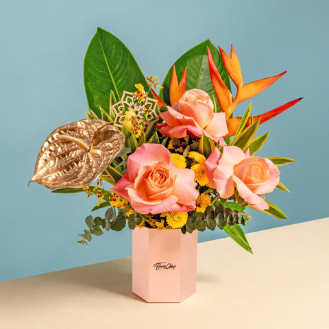 Create beautiful memories this Raya with Kenangan Indah, where sweet pink and warm golden hues come together in perfect celebration. This delightful Hari Raya flower box features vibrant pink coral roses, striking orange heliconias, cheerful yellow pom pom rossi, and elegant yellow dancing lady orchids with song of India and eucalyptus, beautifully presented in a charming pink flower box adorned with gold artificial anthurium and a traditional wooden Raya ornament.