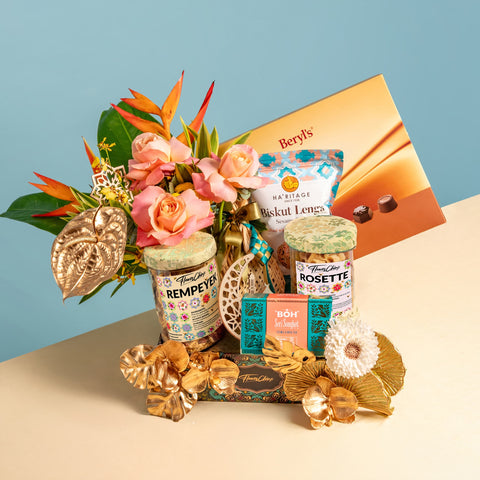 Create sweet memories that last this Raya with Kenangan Manis, where stunning florals meet delightful traditional treats in one impressive gift. This exquisite Hari Raya hamper combines our beautiful Kenangan Indah flower arrangement alongside premium festive delicacies including Beryl Elegance Chocolate, traditional rempeyek, kuih ros, heritage biscuits, Sri Songket BOH Tea, and dodol bakul, all adorned with festive Raya lights, ketupat ribbon, gold orchids, sola wood daisies, elegant songket cloth, gold monstera, gold blossoms, and a wooden Raya ornament.