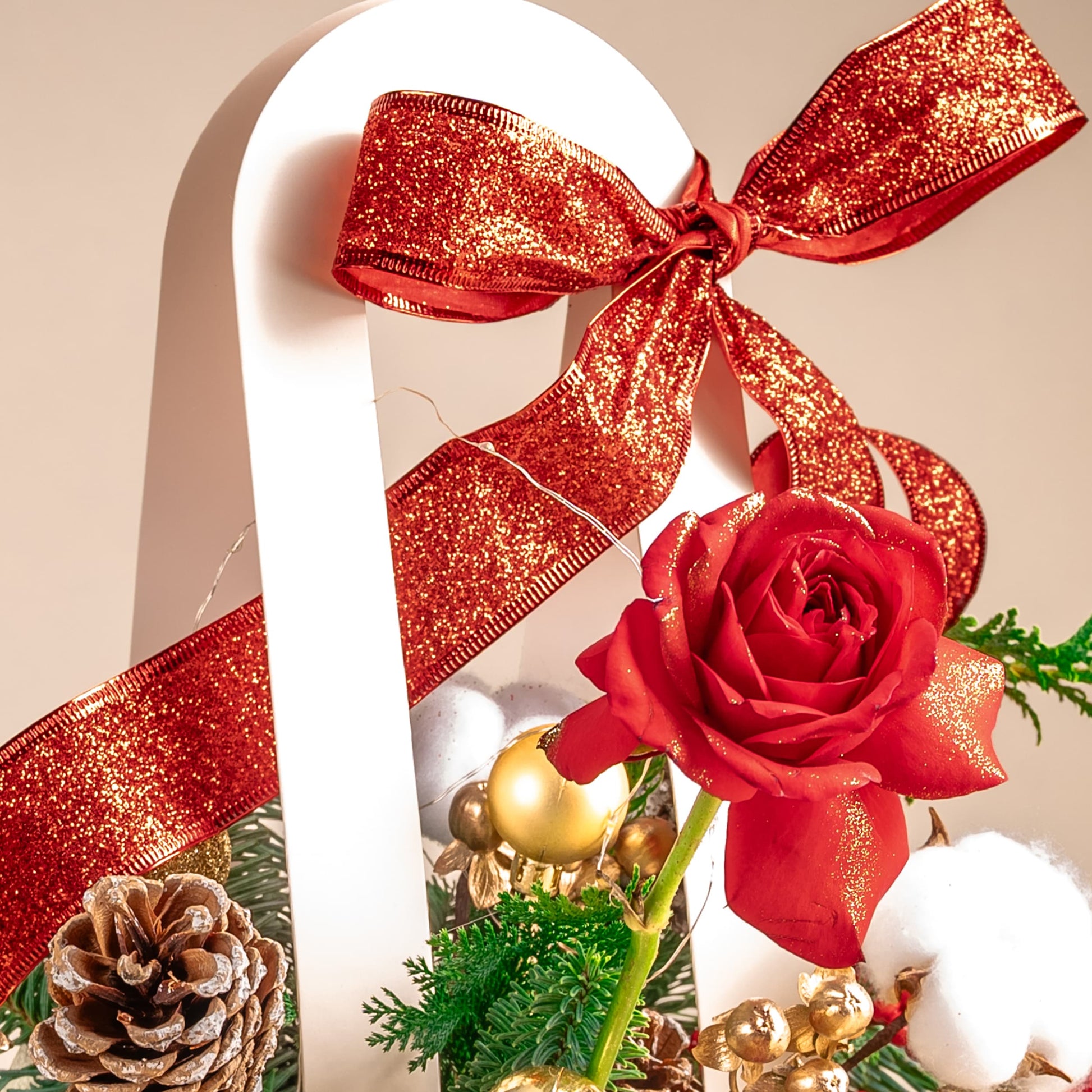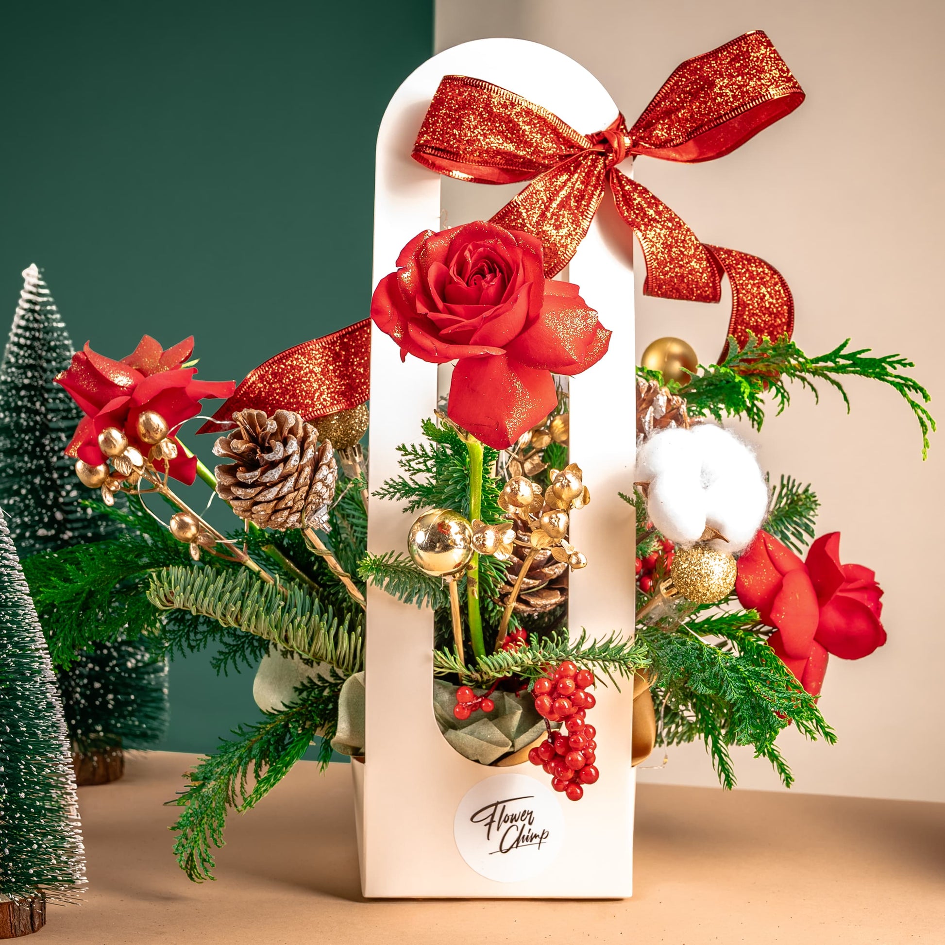 Festive sophistication shines through in this gorgeous hand-held treasure that captures the essence of Christmas elegance! Stunning red roses take center stage alongside vibrant red berries, rustic pine cones, and lush winter greenery, creating a refined celebration of the season. Adorned with sparkling golden ornaments and twinkling fairy lights that add enchanting glow, this stylish memento embodies the magic of the holidays with graceful charm and timeless festive beauty.