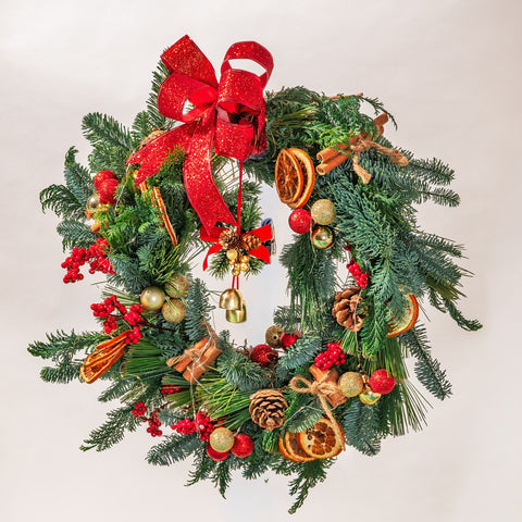 Deck your halls with pure festive joy! This beautiful Christmas wreath brings together the warmth of the season with stunning pine cones, fragrant cinnamon sticks, vibrant red berries, and dehydrated orange slices. Adorned with golden ornaments, cheerful jingle bells, and twinkling fairy lights that add a magical glow, this joyous wreath creates the perfect celebration of Christmas spirit and transforms any space into a winter wonderland!