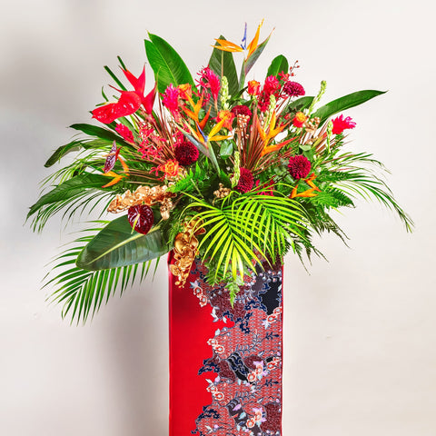 Show them their success deserves nothing less than extraordinary with a vibrant arrangement designed to turn heads. This wild and passionate display features bird of paradise, red and maroon extra large anthuriums, and orange red roses as the star blooms, complemented by red crab claw, red ginger, orange heliconia, white tuberose, red friendship orchid, maroon ping pong, and red berries, finished with lush palm leaves, green paku, and red marginata in a passionate red batik signature box. With its untamed beauty and rich heritage design, this makes the perfect gift to celebrate remarkable business achievements and their exciting new adventure.