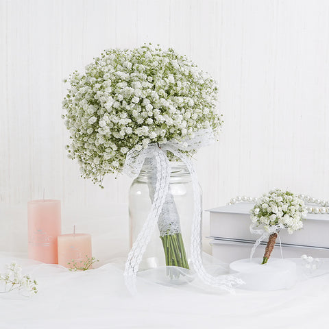 A timeless arrangement of pristine white baby's breath blooms, brimming with ethereal allure & pure enchantment. Take your first steps towards an eternally Sacred Bond, with the perfect wedding bouquet & boutonnière, sure to add whispers of whimsy & magic to your wedding day.