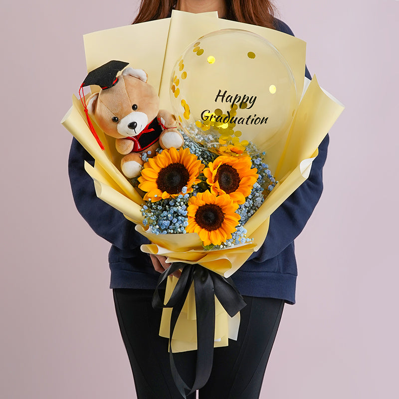 This bouquet has a warm glow that fits a graduation day perfectly. The colors feel upbeat, the arrangement looks thoughtful, and it brings a cheerful touch to photos and celebrations.
