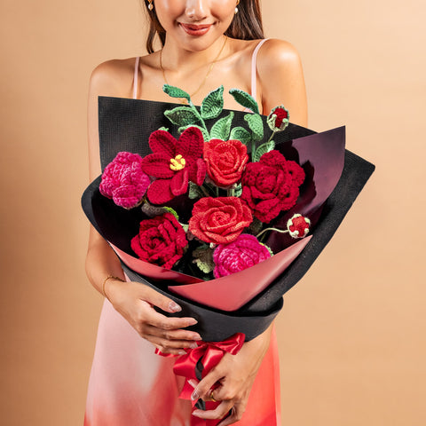 Some feelings don't fade with time, they only grow stronger, more certain, more beautiful, and Together Forever captures that enduring magic perfectly. This handcrafted arrangement features 2 red crochet roses, 2 hot pink crochet roses, 2 maroon crochet roses, and 1 maroon crochet blooming tulip, beautifully complemented by light green crochet leaves for a keepsake that lasts as long as your love.